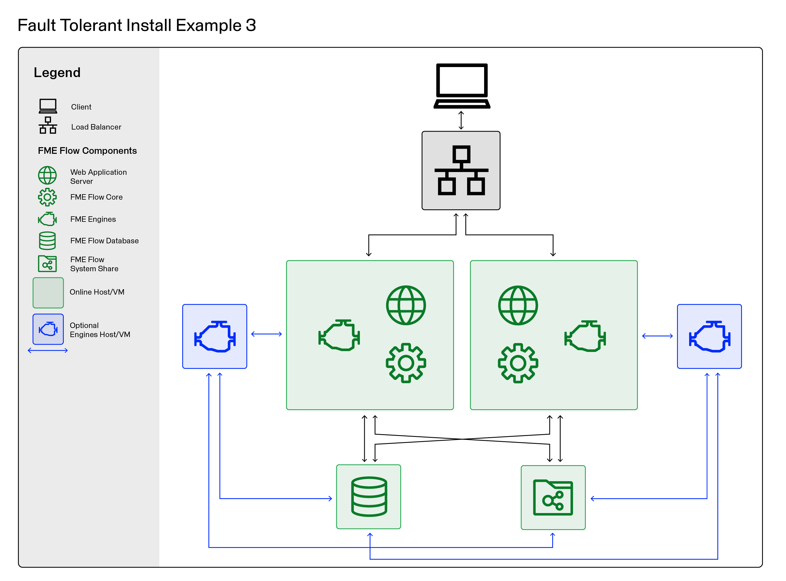 Organizations are expected to maintain the FME Flow Database and FME Flow System Share (a file system for hosting Repositories and Resources) on their own fault-tolerant servers. This ensures the fault-tolerant FME Flow has reliable access to workspaces, repositories, resources, and other items.
